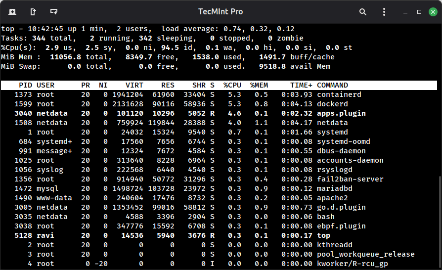 top is one of the first tools any Linux administrator learns, and for good reason, it gives you a live, continuously refreshing view of all running processes along with CPU usage, memory usage, load average, swap, and more, all in one screen.