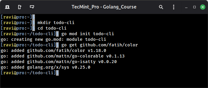 We are importing the same fatih/color package from Lesson 3, so the output looks clean and readable in the terminal.