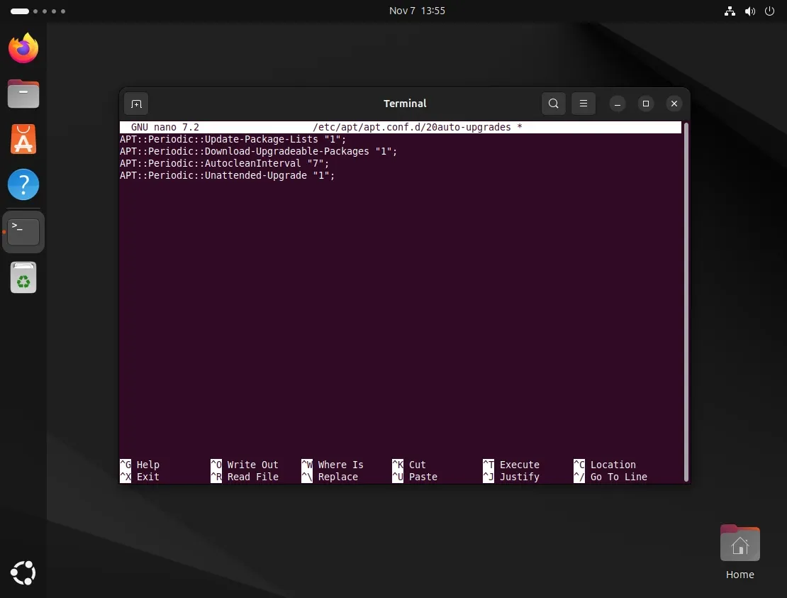 APT::Periodic::Update-Package-Lists "1";- Tells Ubuntu to refresh the list of available updates from software repositories;"1"means it checks every day.APT::Periodic::Download-Upgradeable-Packages "1";- Automatically downloads updates that can be installed;"1"means this happens daily.APT::Periodic::AutocleanInterval "7";- Cleans up old, unnecessary package files to free disk space;"7"means this runs once a week.APT::Periodic::Unattended-Upgrade "1";- Installs updates automatically, usually security updates;"1"means this runs daily without user intervention.